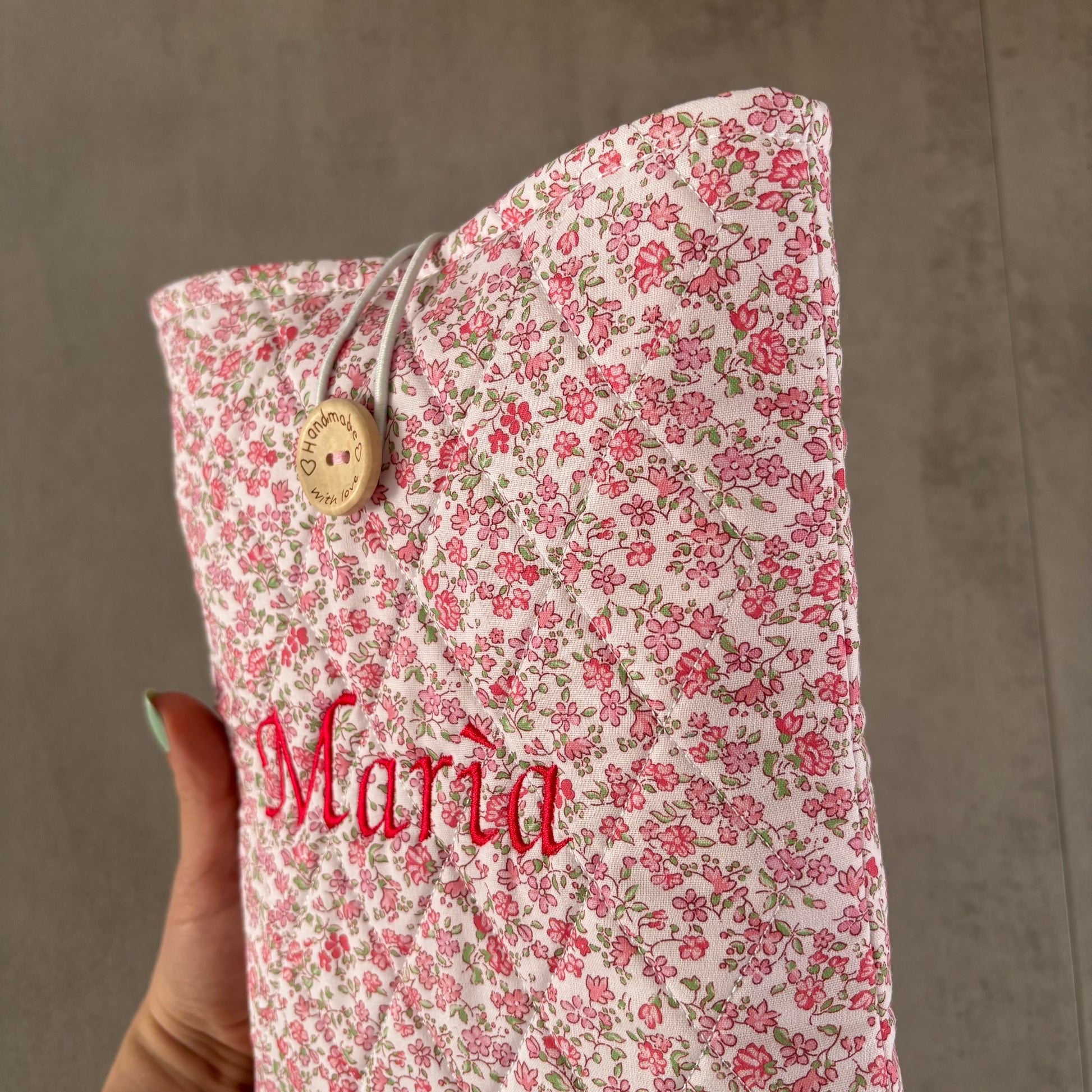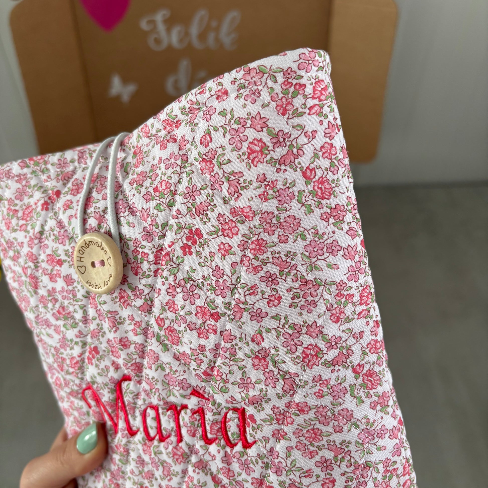 • Funda tamaño estándar (21x28cm), acolchada y bordada con el nombre que nos indiquéis en instrucciones del pedido.