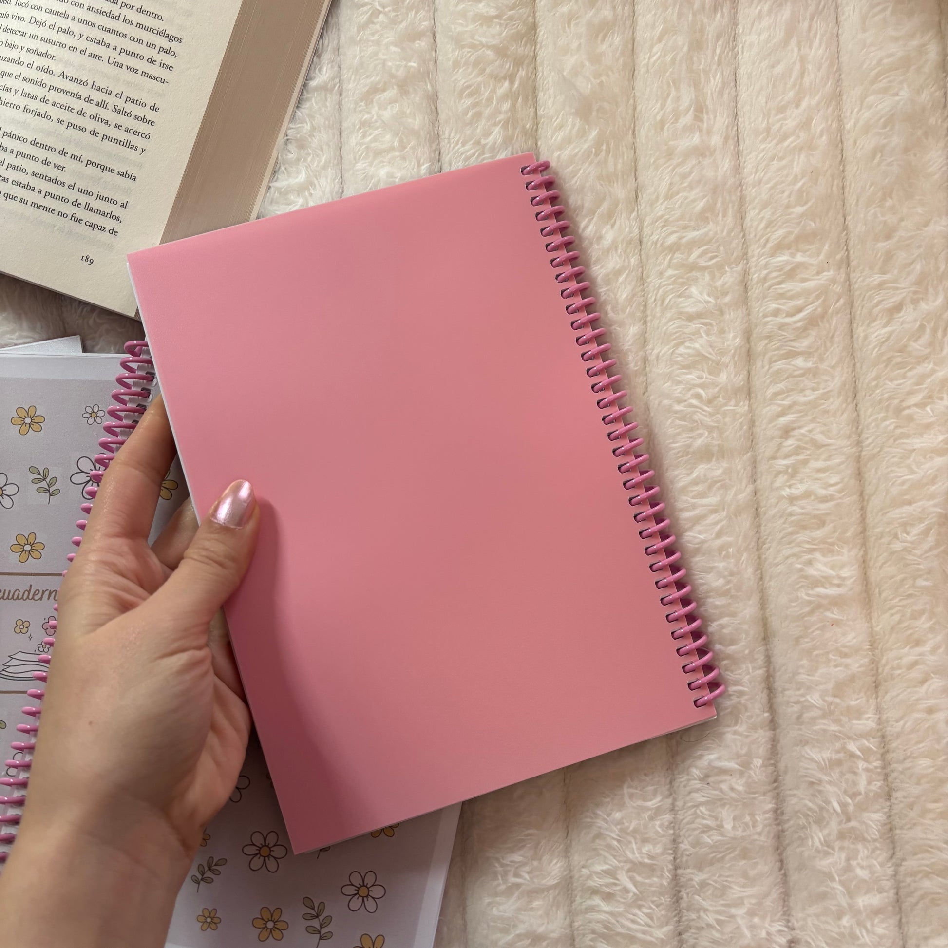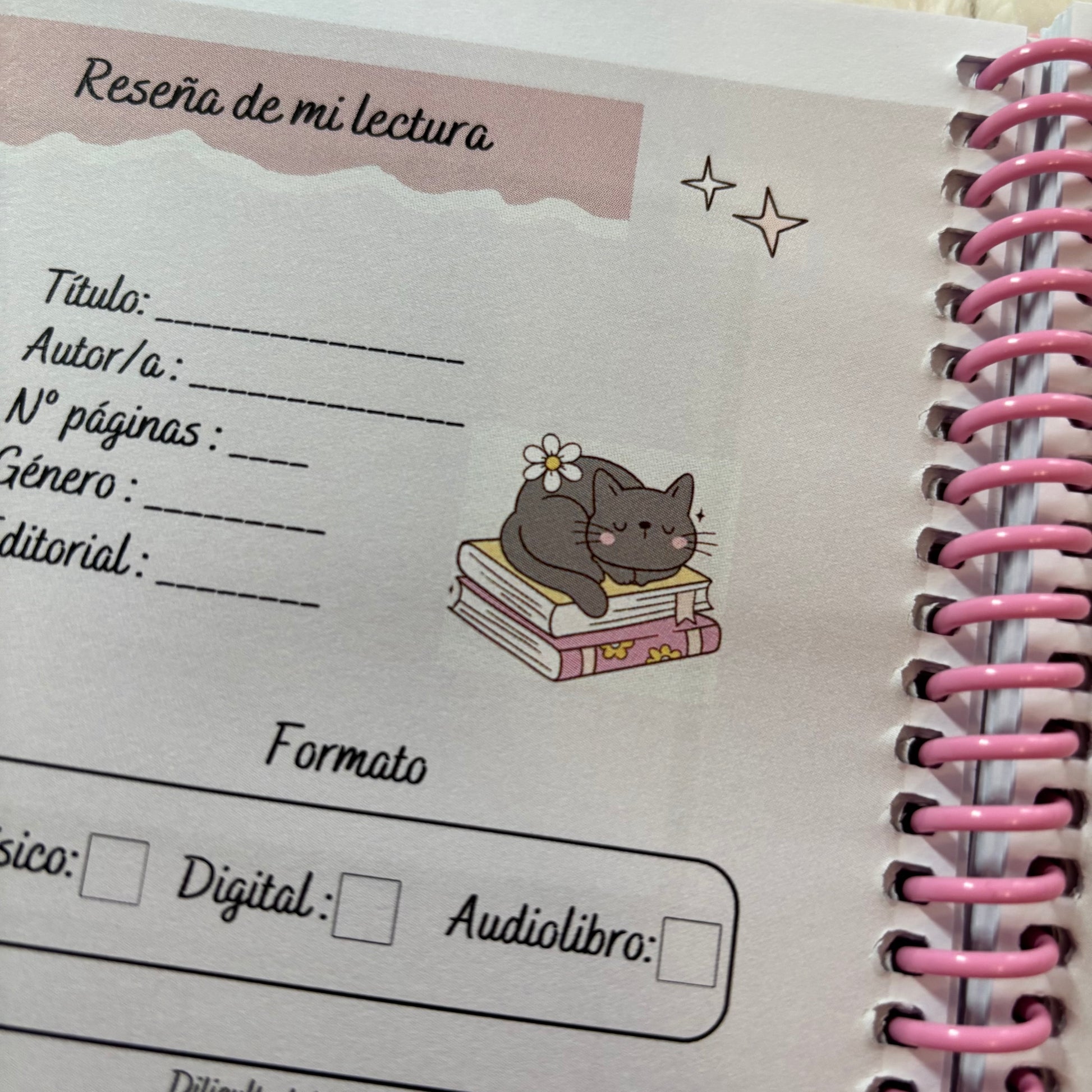 Es de tamaño A5, está encuadernado con anillas y una contraportada en color rosa. Las hojas son de 80g.