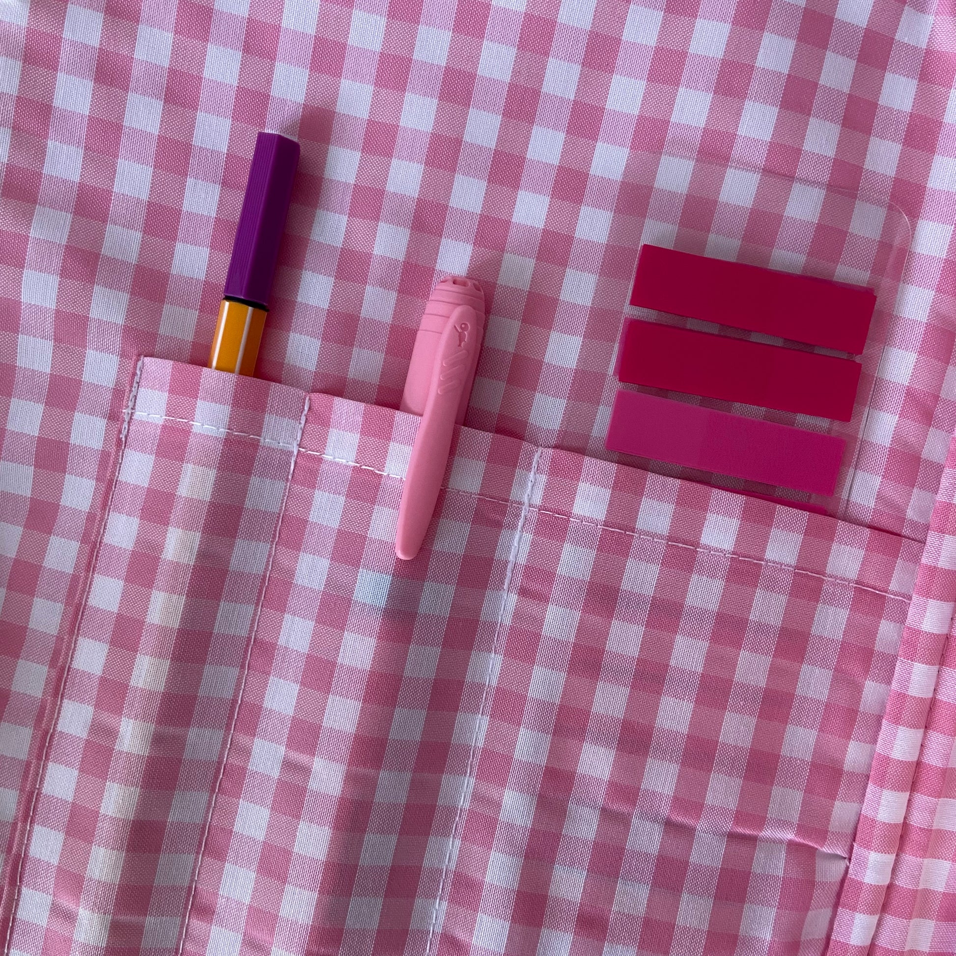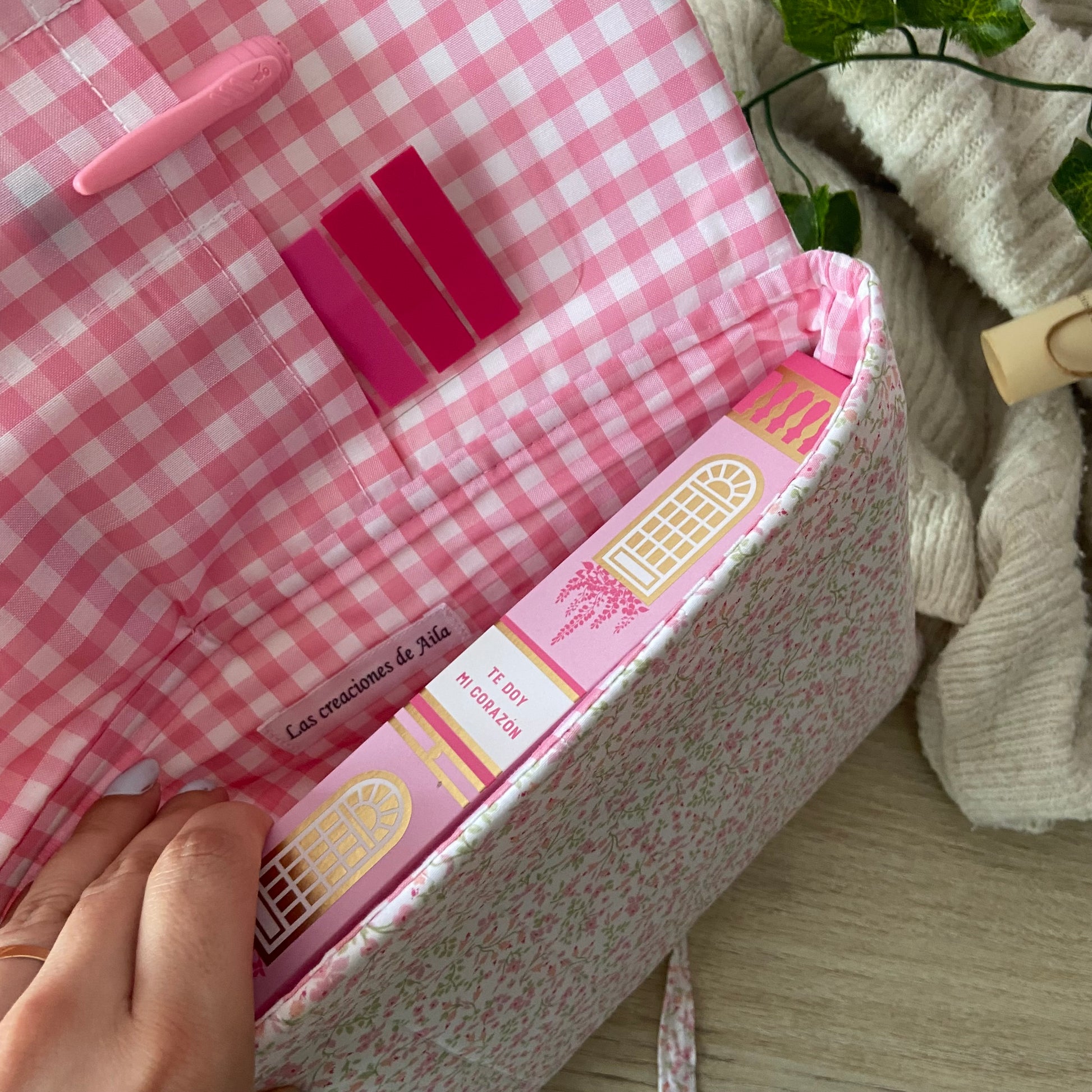 Cuenta con unos bolsillos dentro para poder guardar positivos, bolígrafos, marcapáginas, etc.