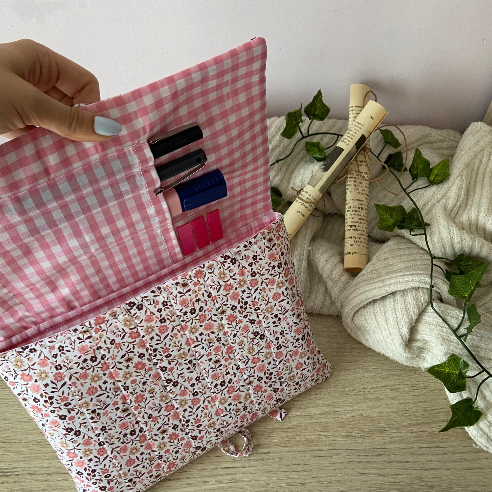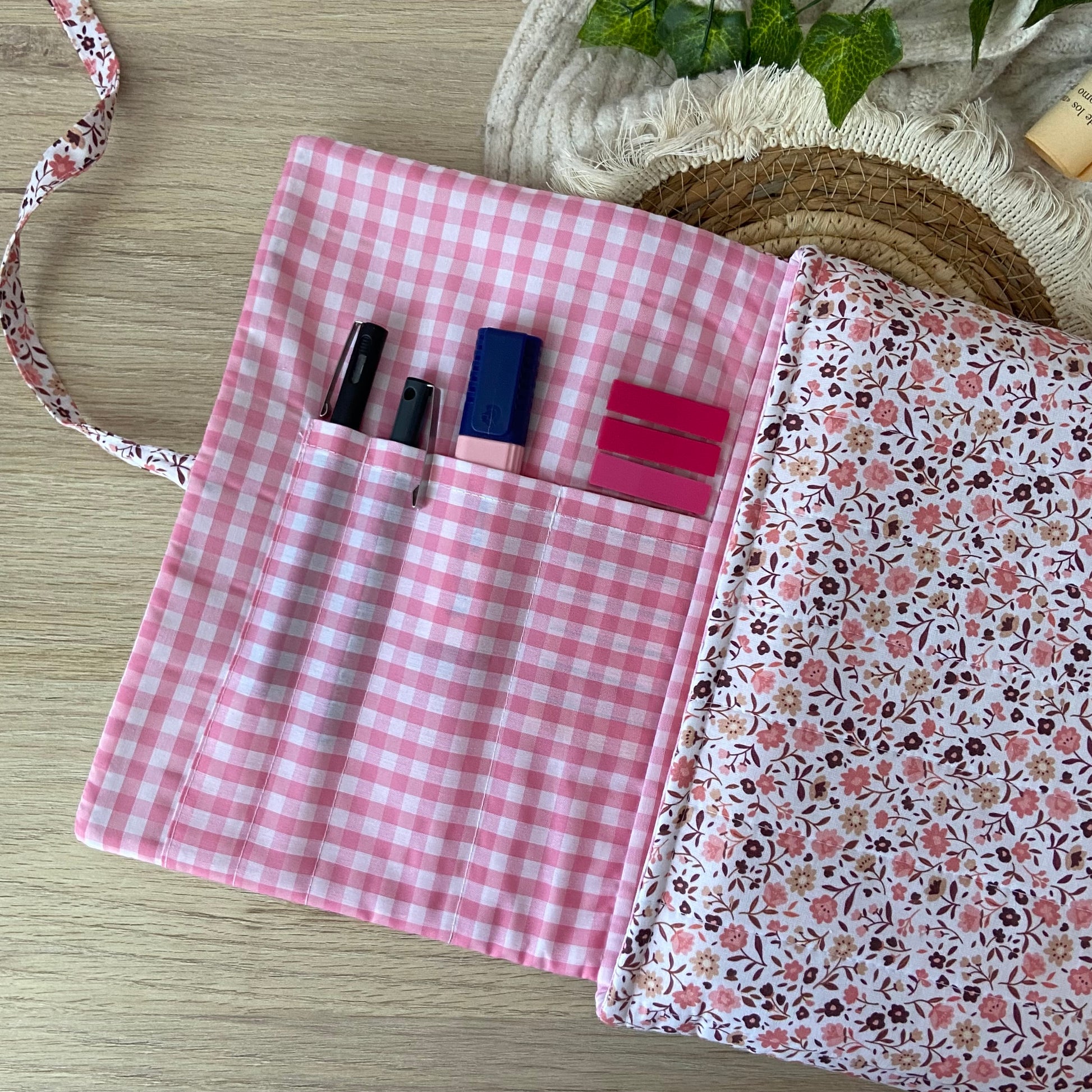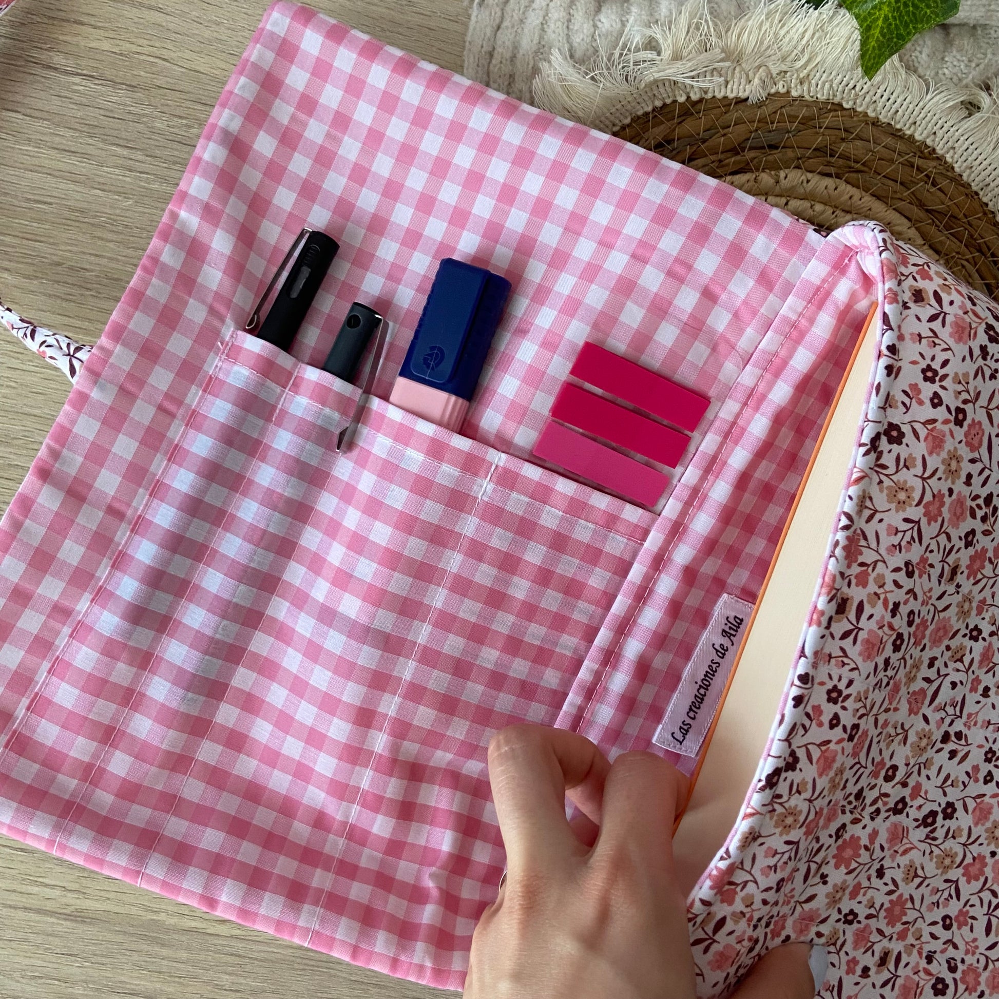 Cuenta con unos bolsillos dentro para poder guardar posits, bolígrafos, marcapáginas etc.