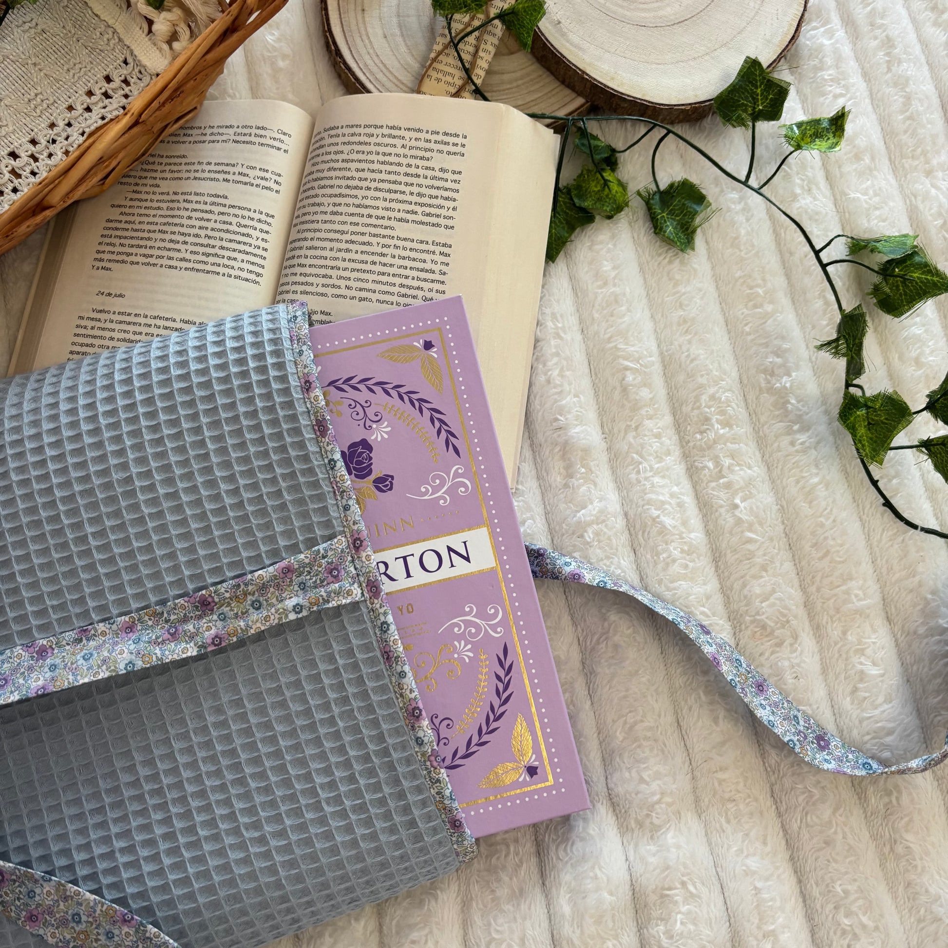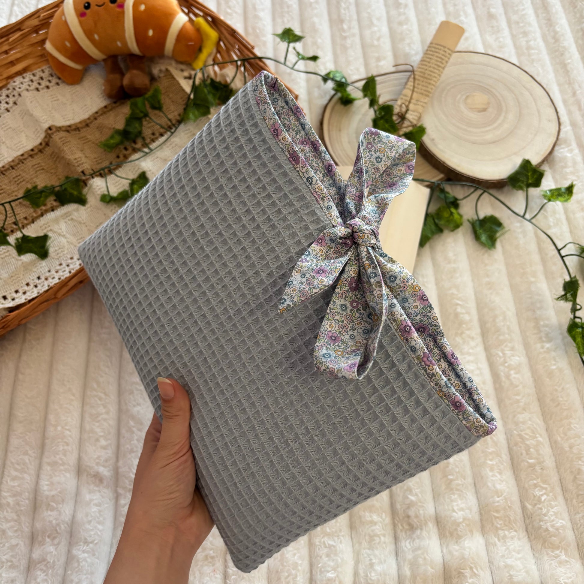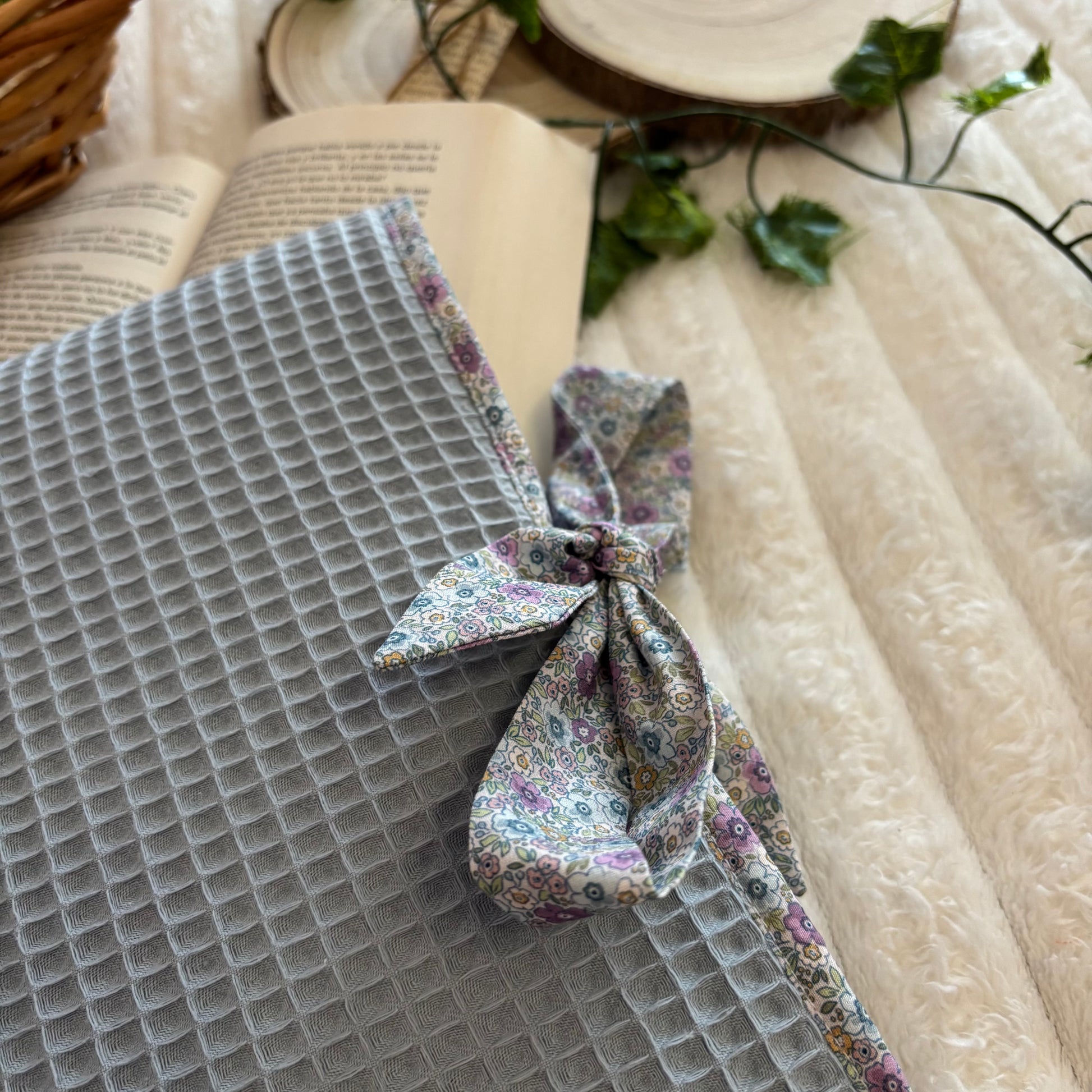 Funda literaria de tela waffle en azul con forro de flores y lazo a conjunto. Las medidas son de 21x28cm