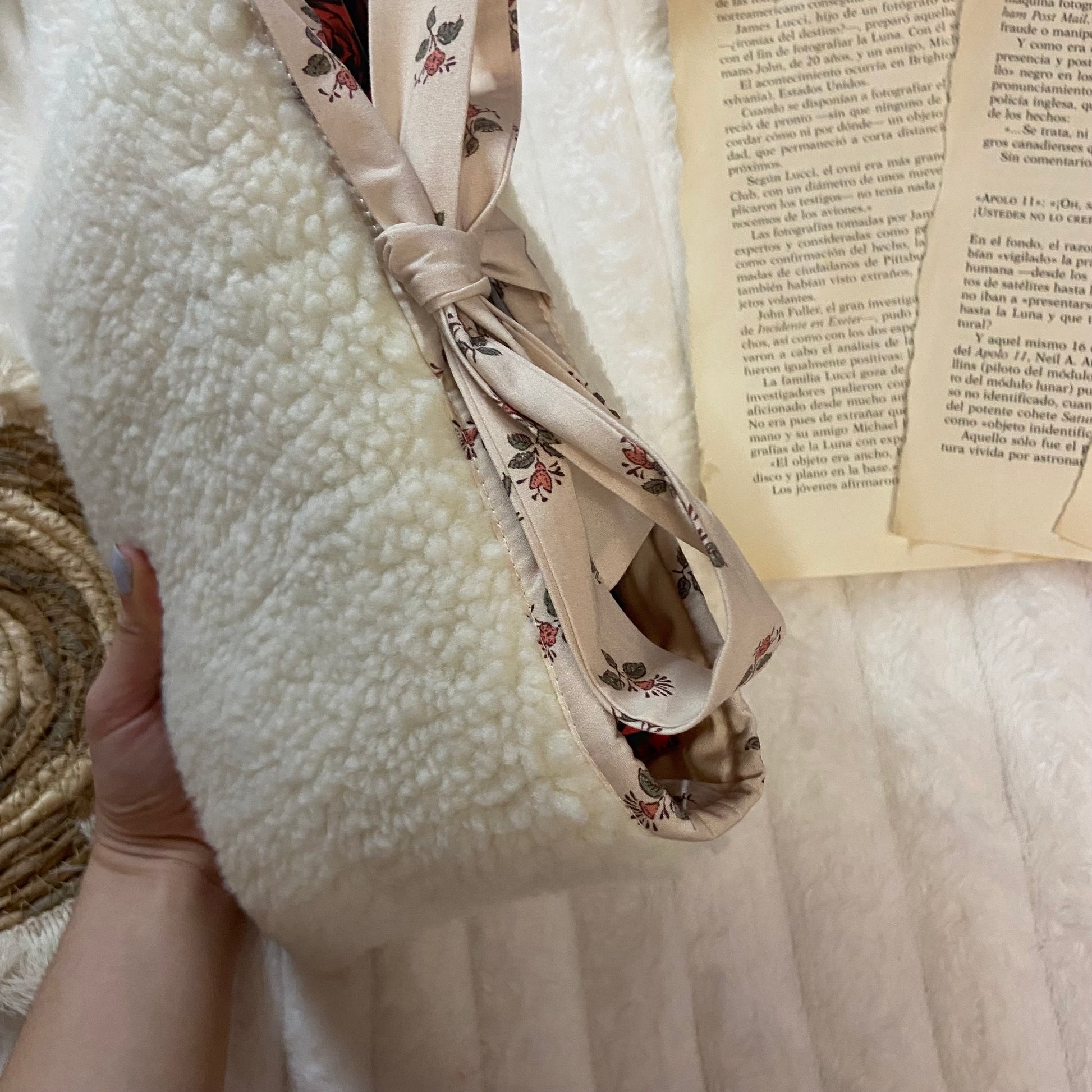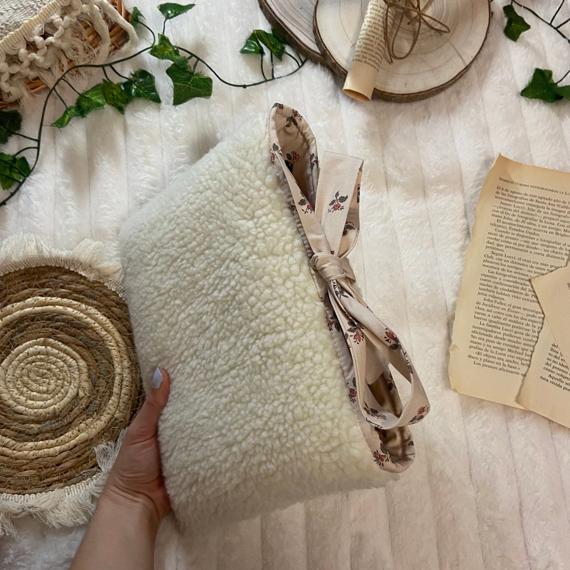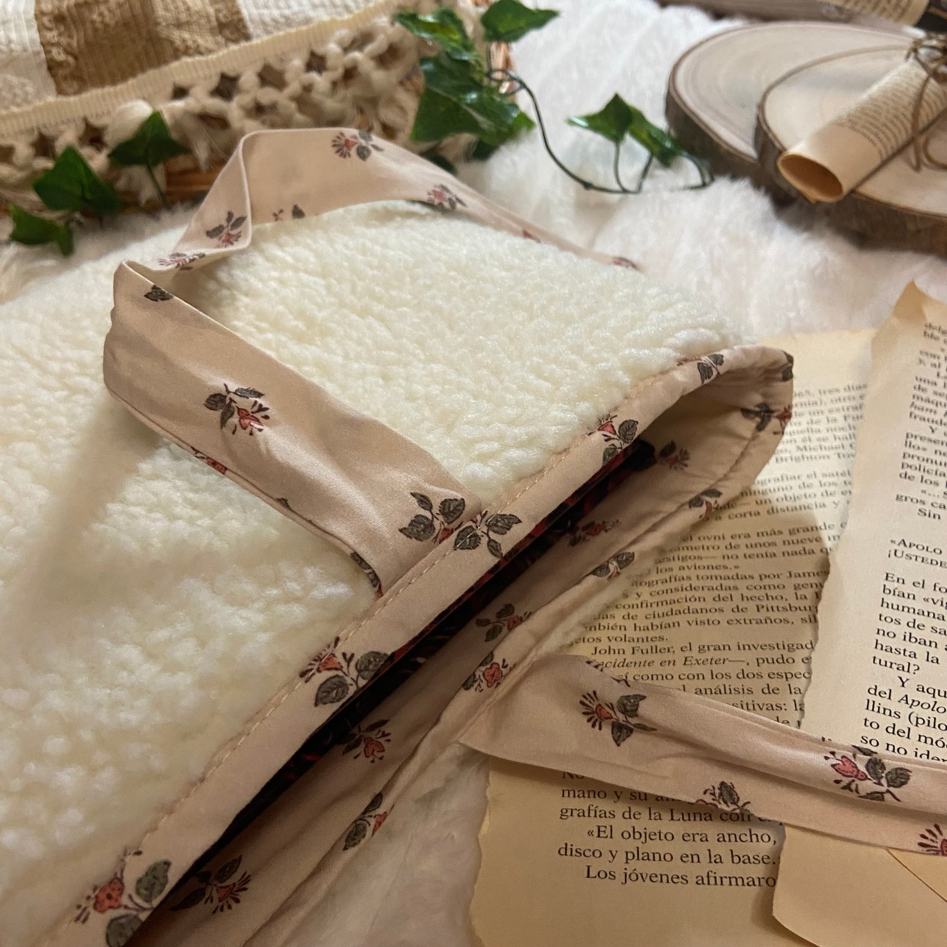 Funda literaria de borreguito con forro y lazo a conjunto. Las medidas son de 21x28cm