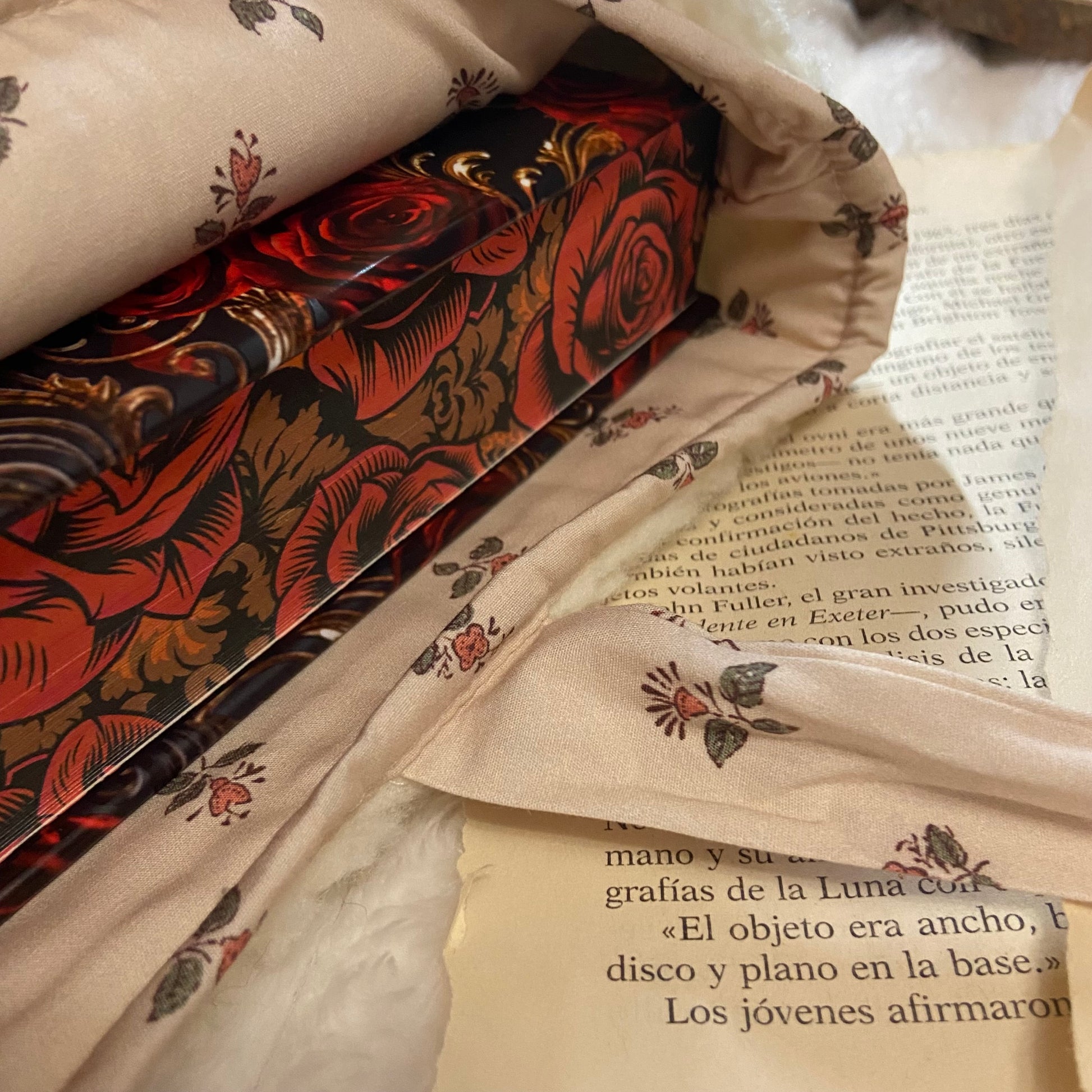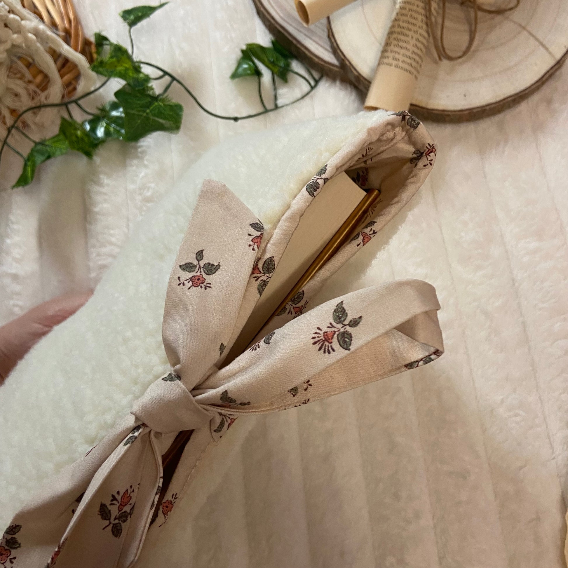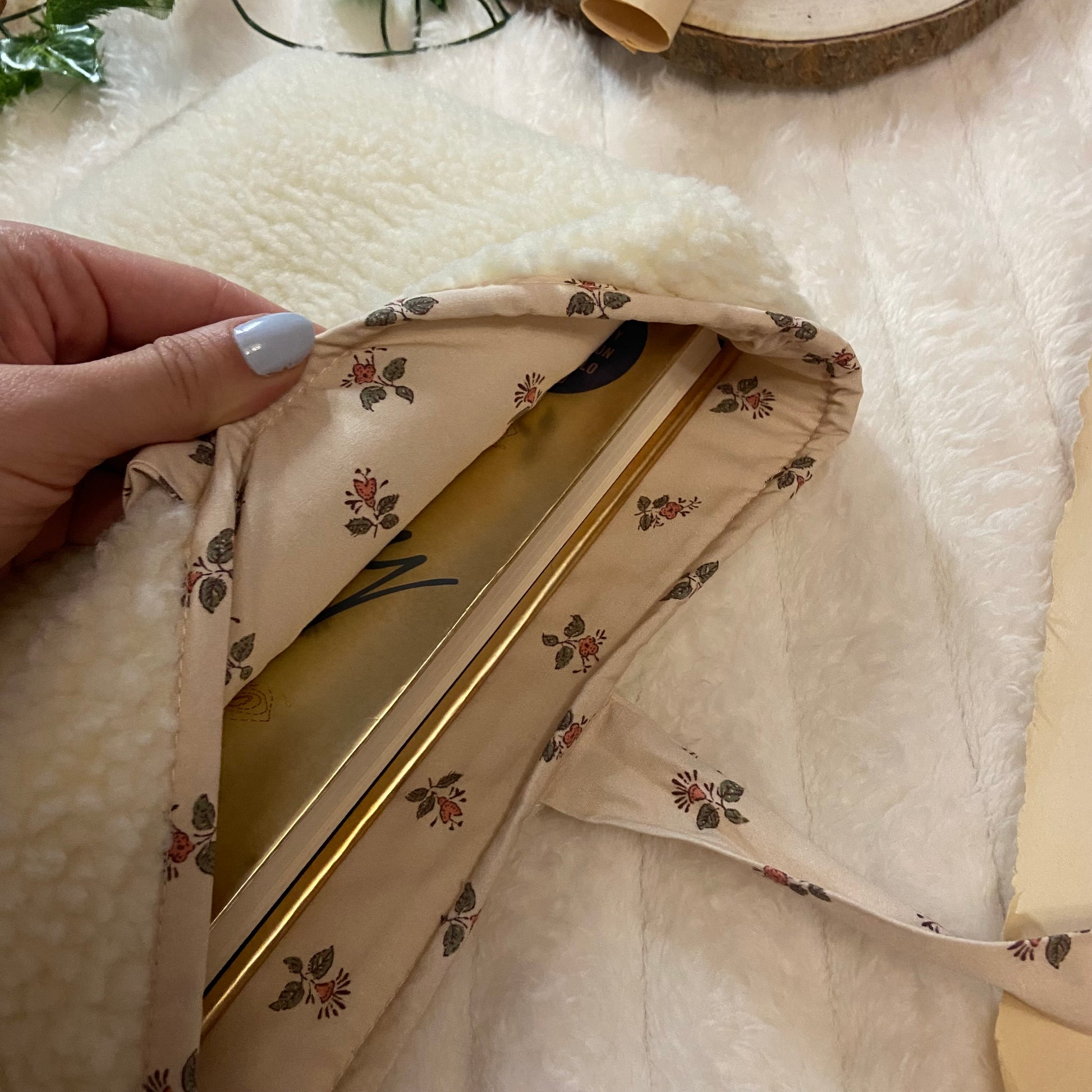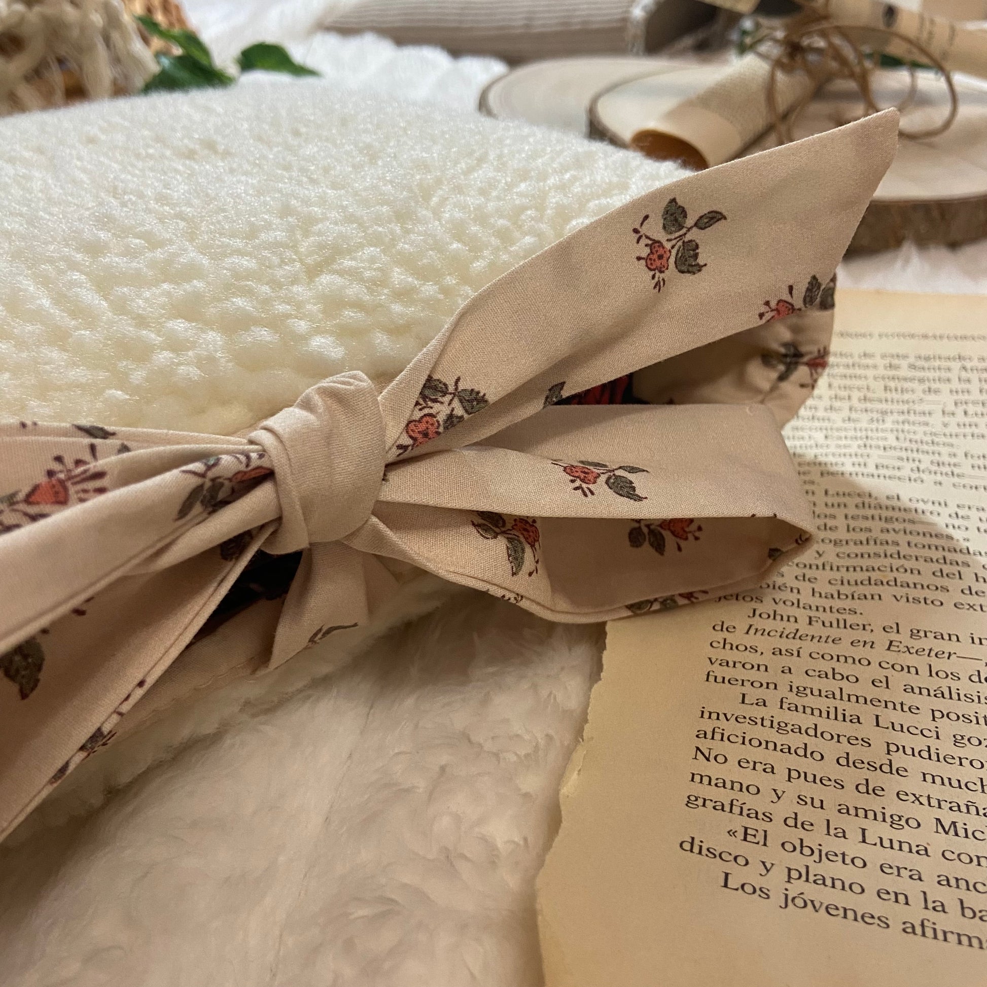 Funda literaria de borreguito con forro y lazo a conjunto. Las medidas son de 21x28cm