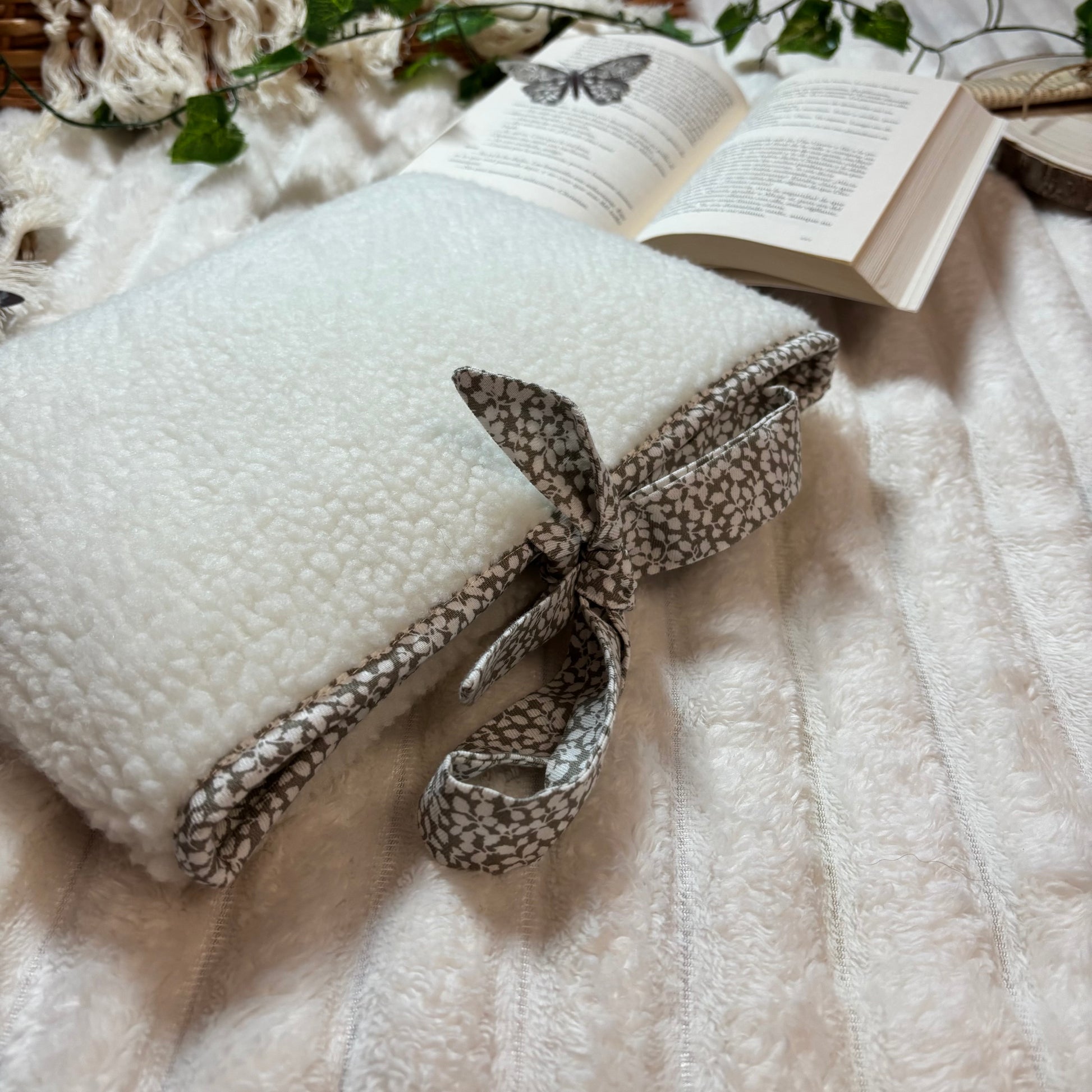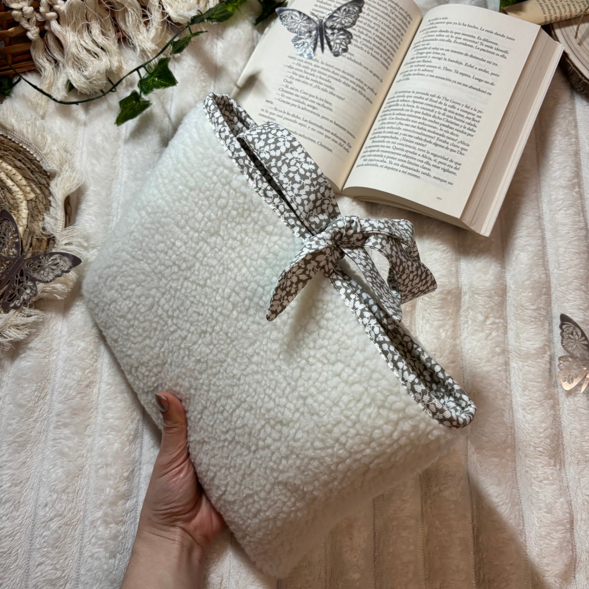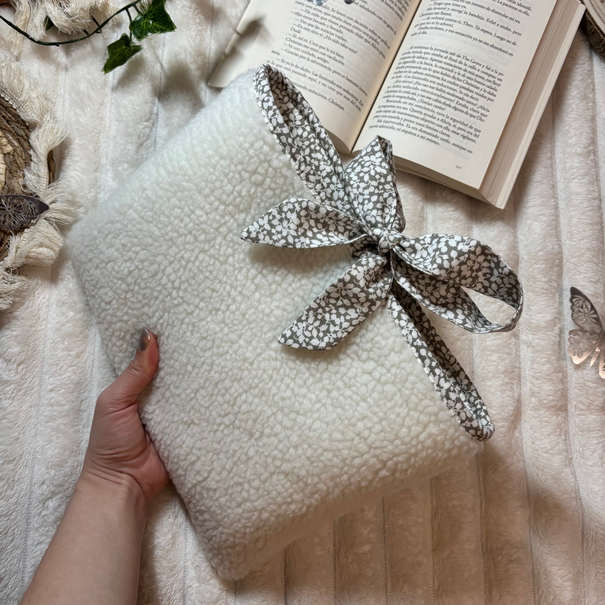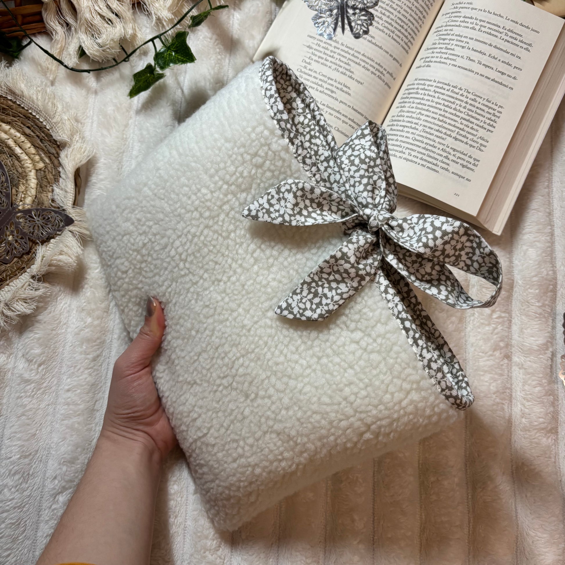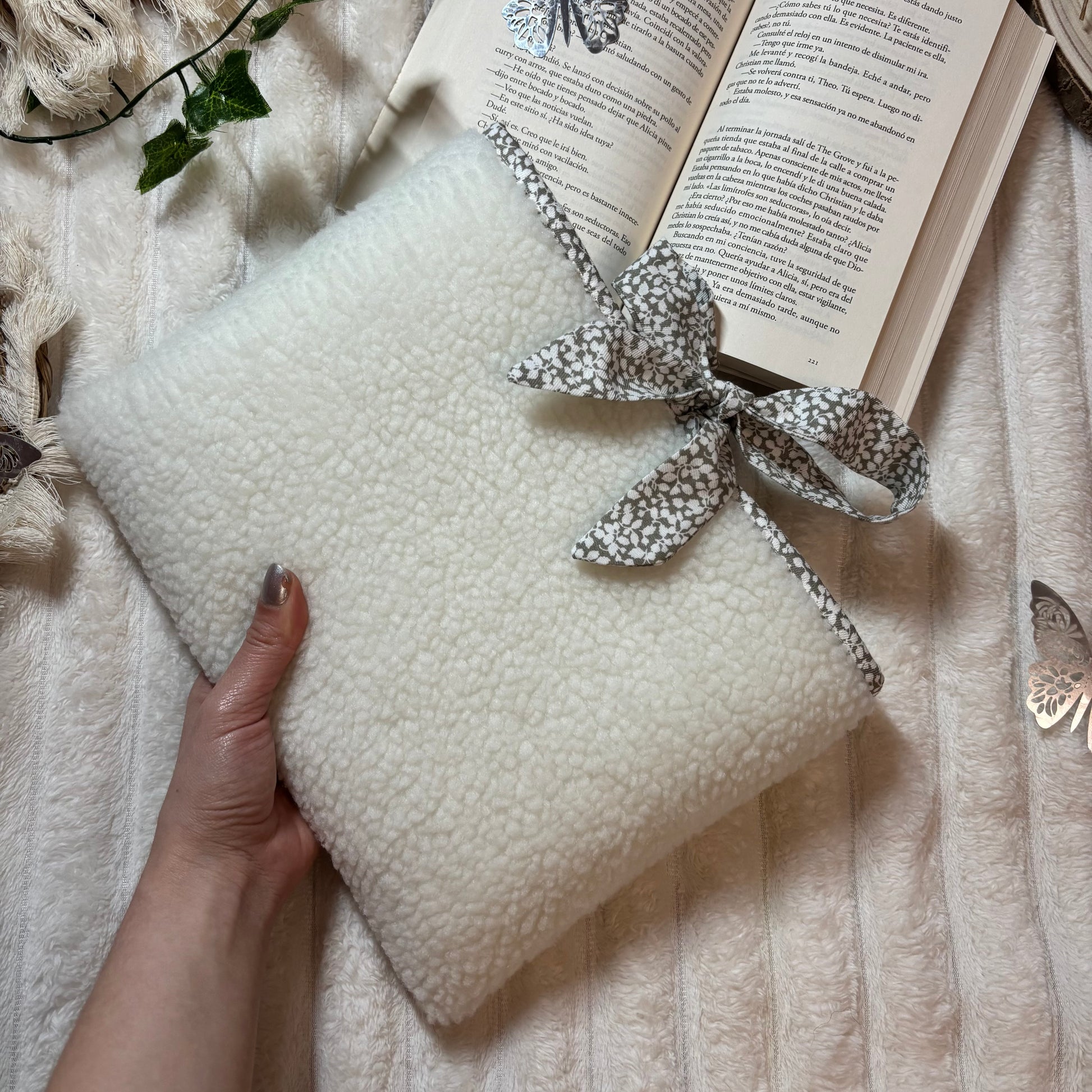 Funda literaria de borreguito con forro y lazo a conjunto. Las medidas son de 21x28cm
