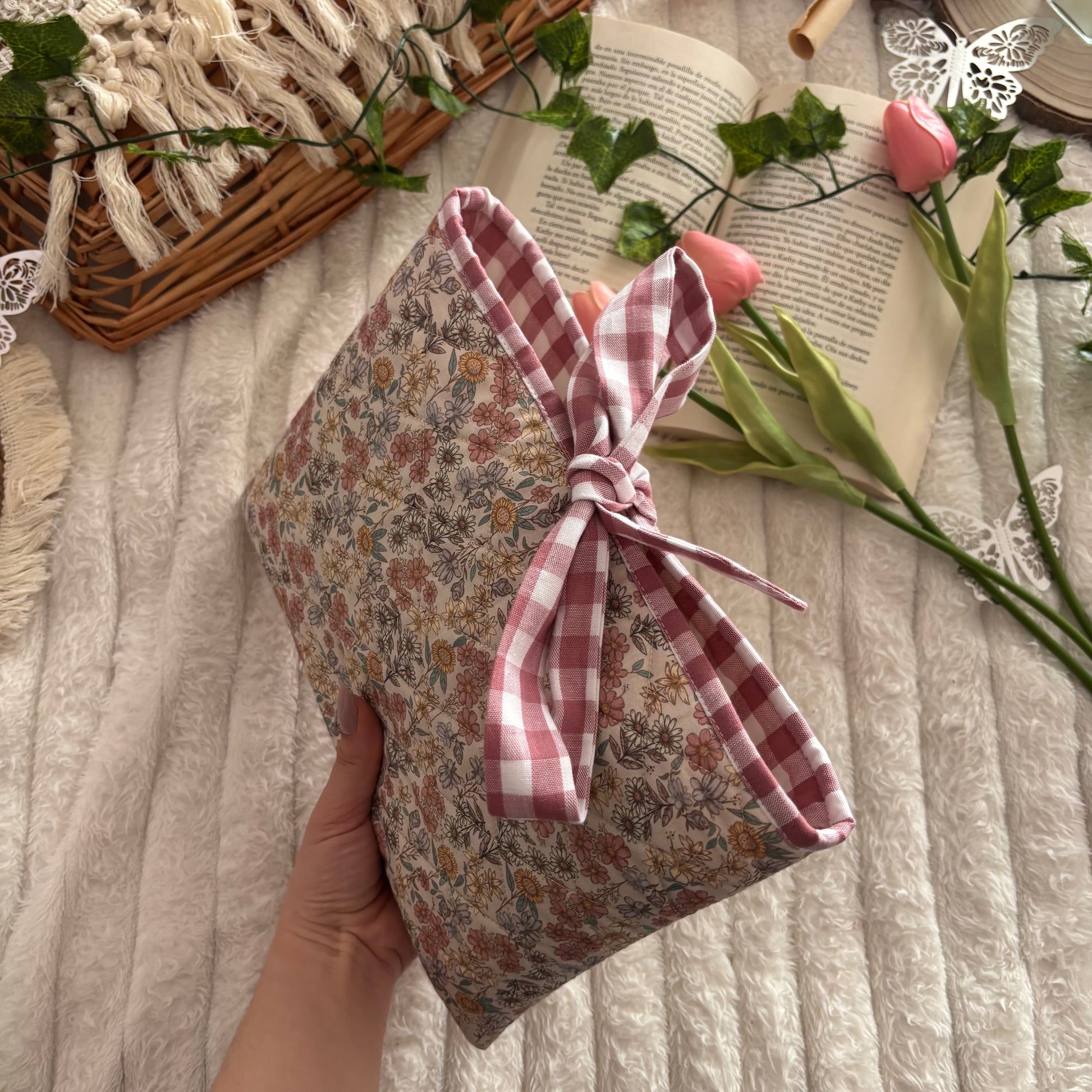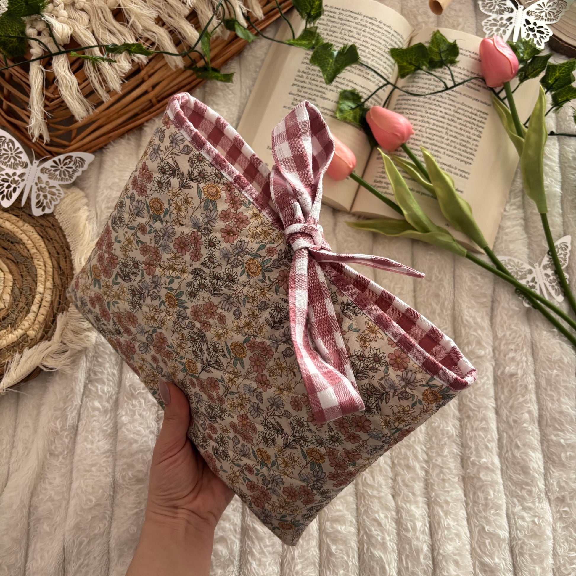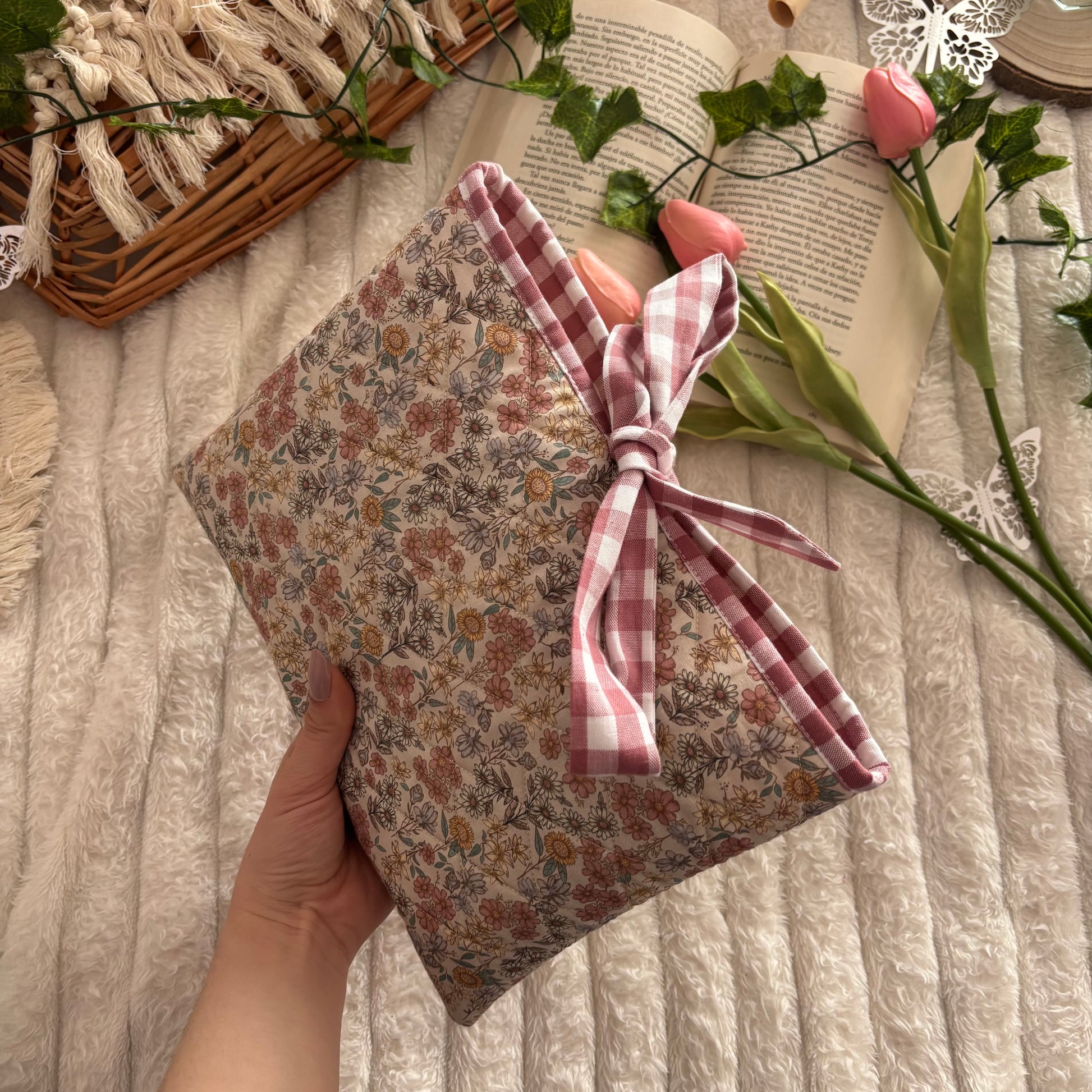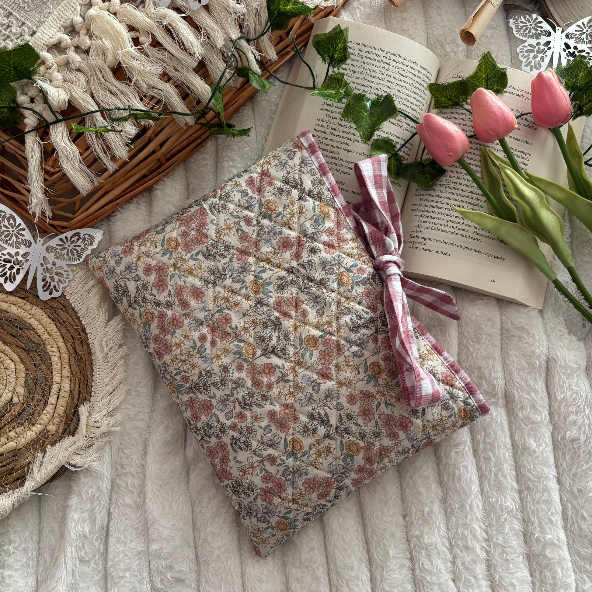 Funda literaria acolchada, con forro y lazo a conjunto. Las medidas son de 21x28cm.