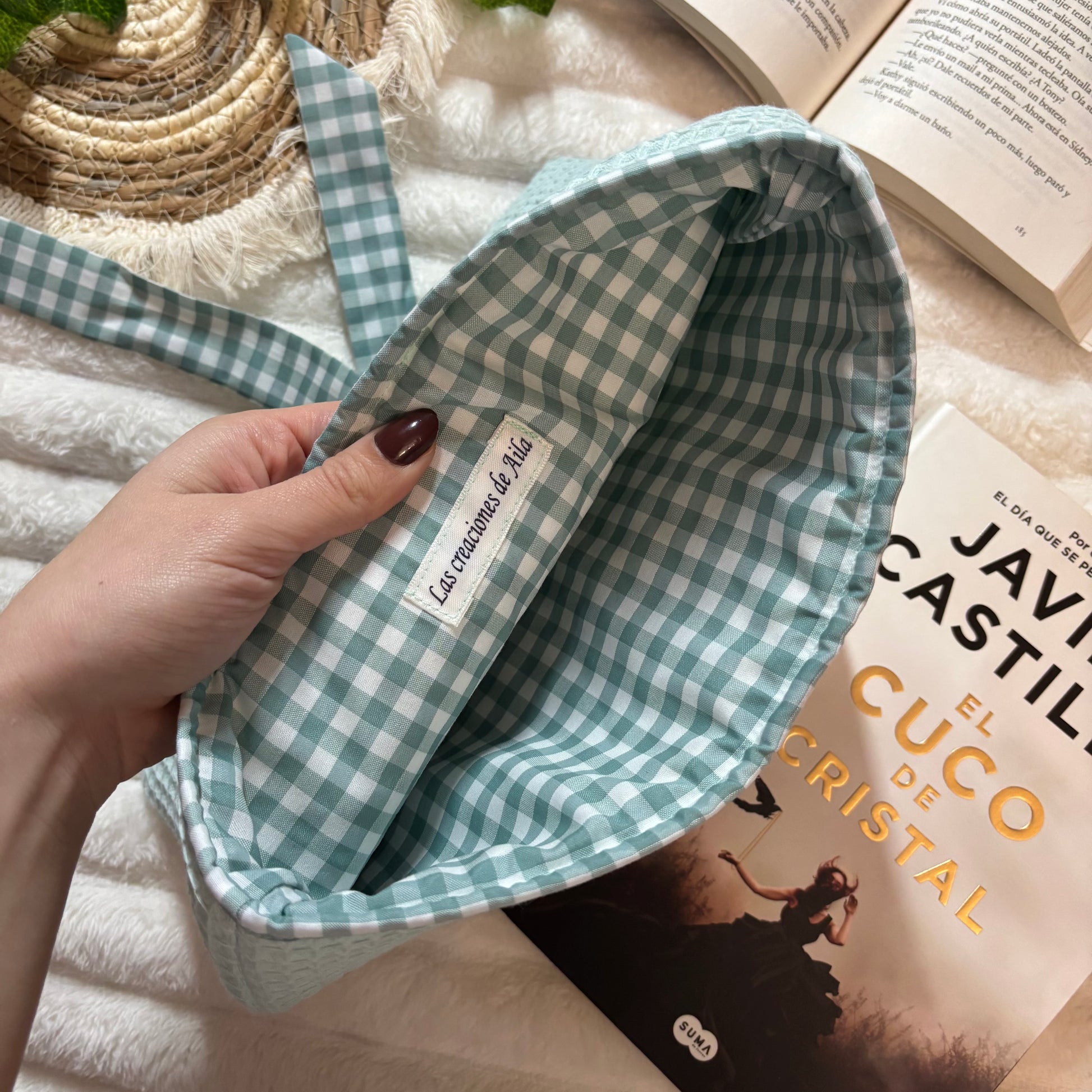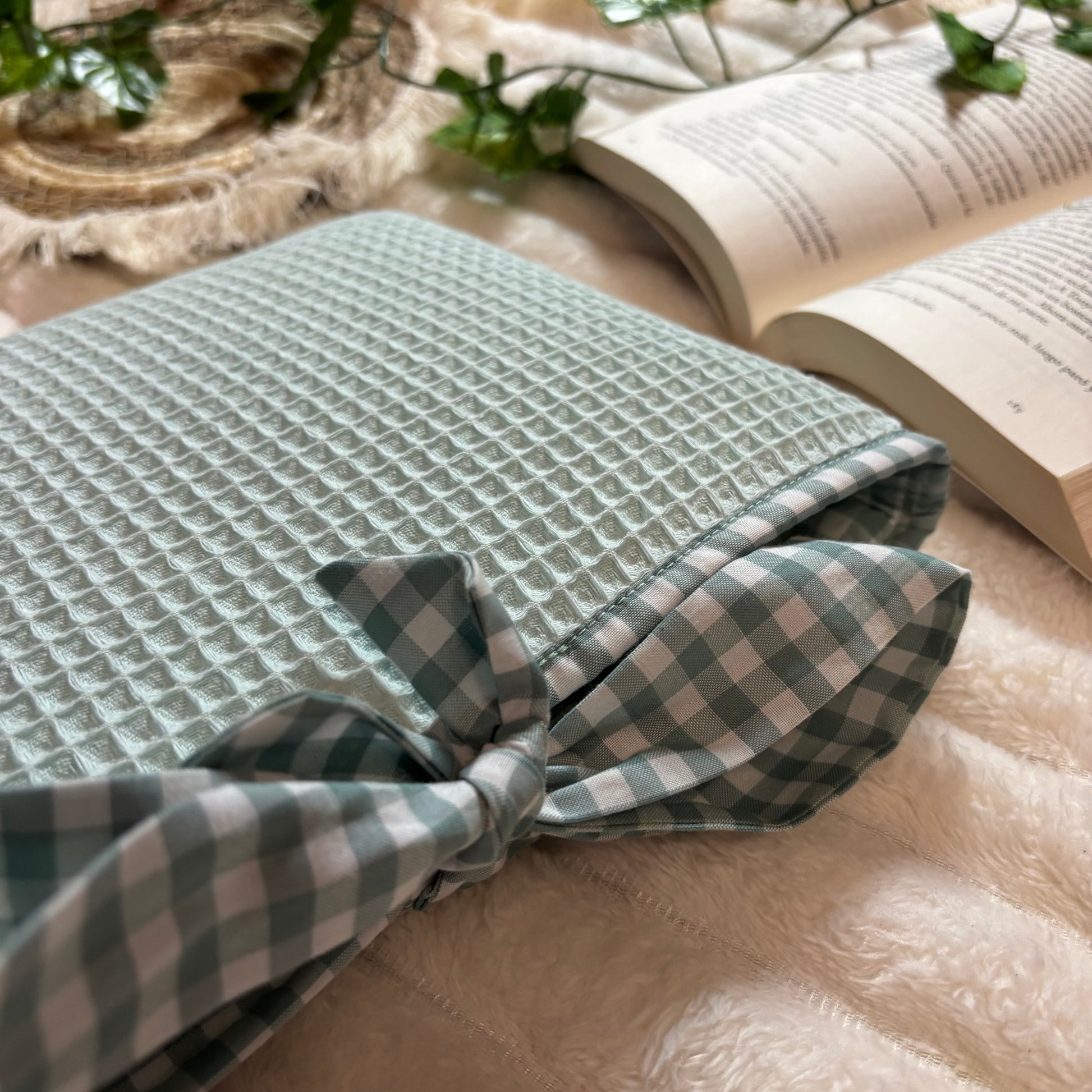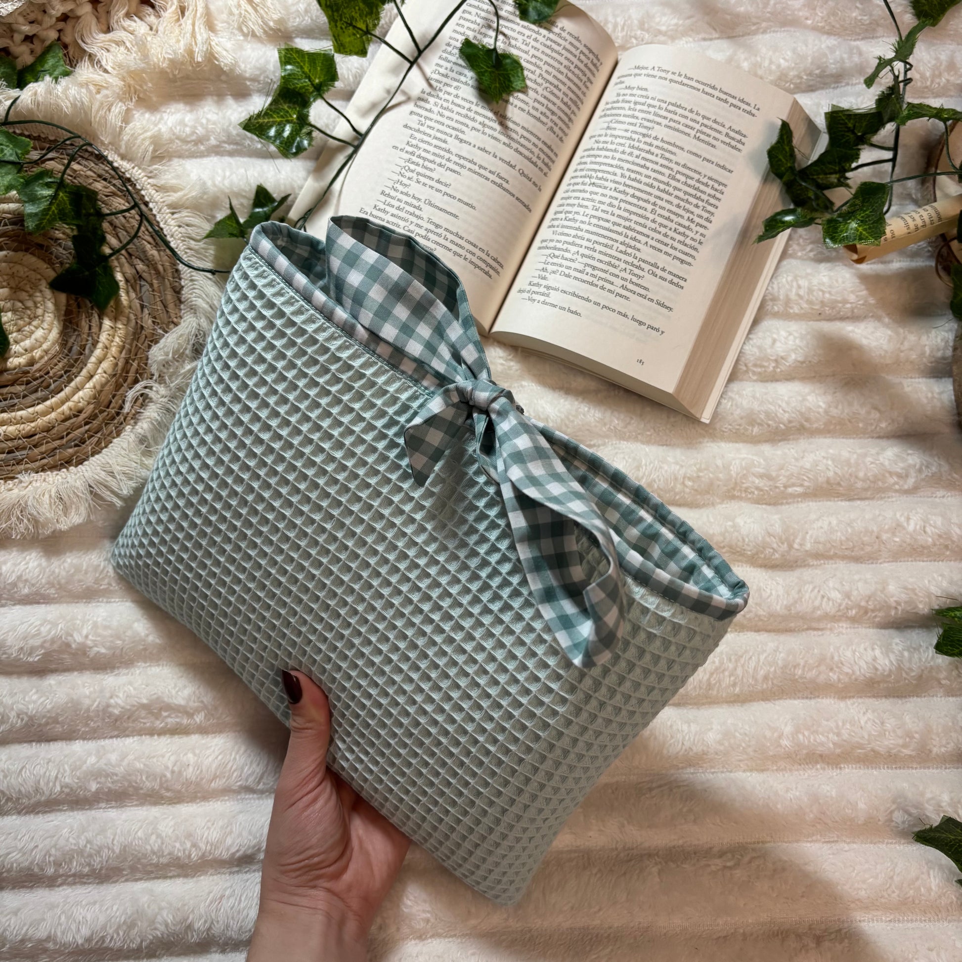 Funda literaria de tela waffle en verde con forro y lazo a conjunto. Las medidas son de 21x28cm