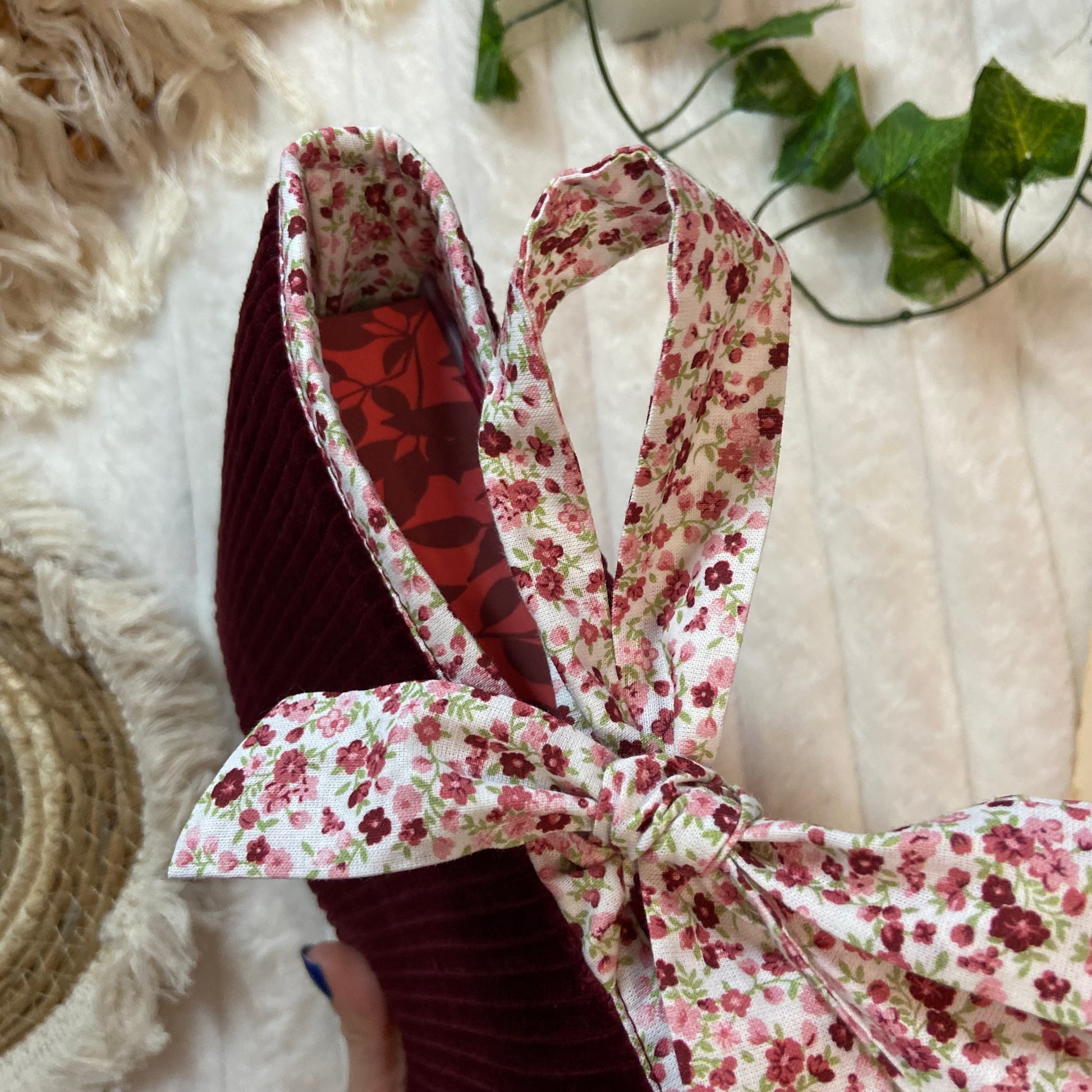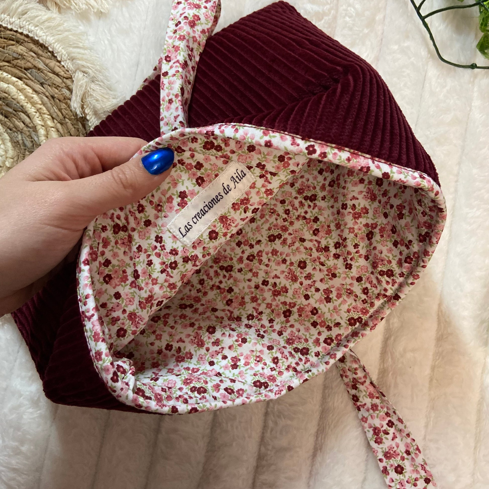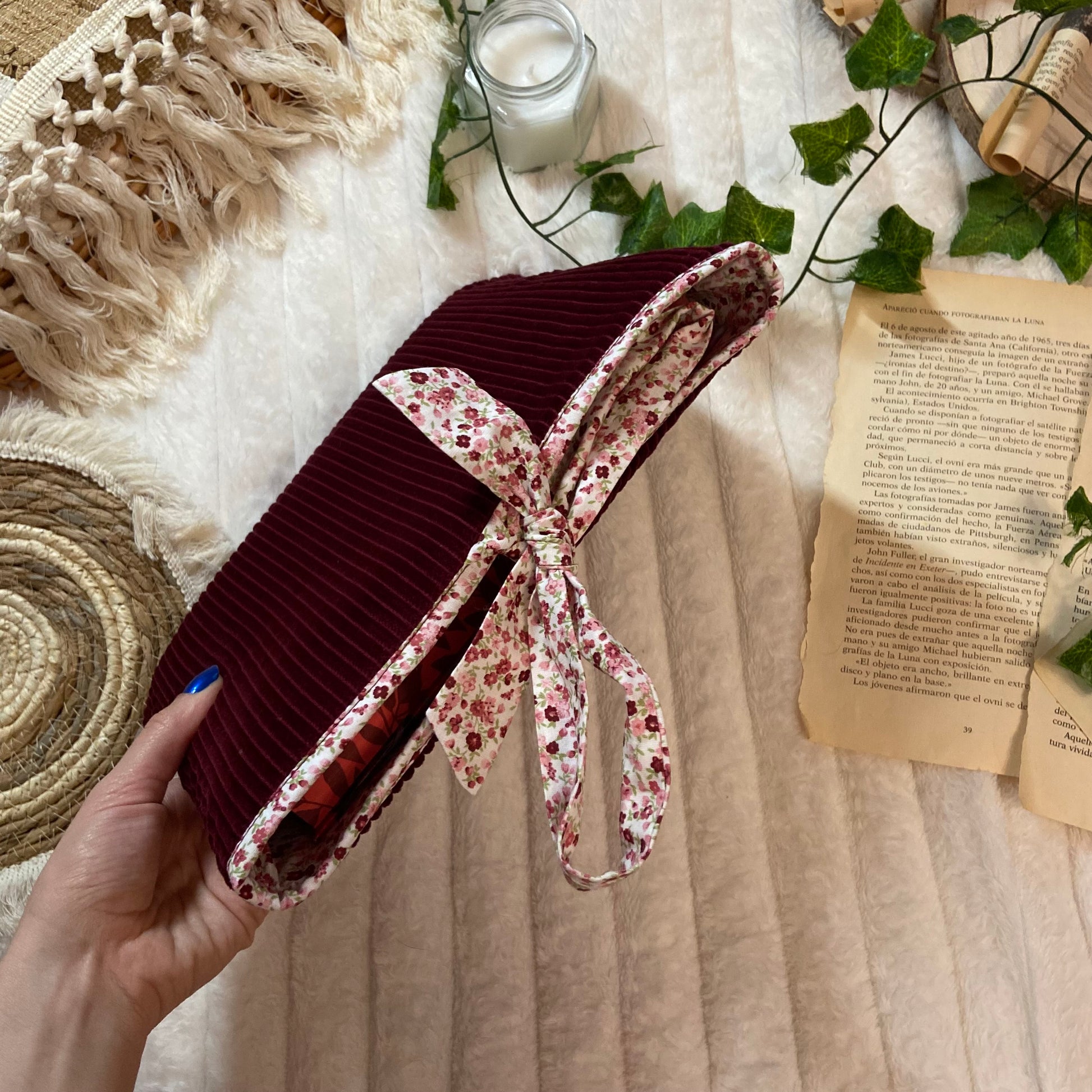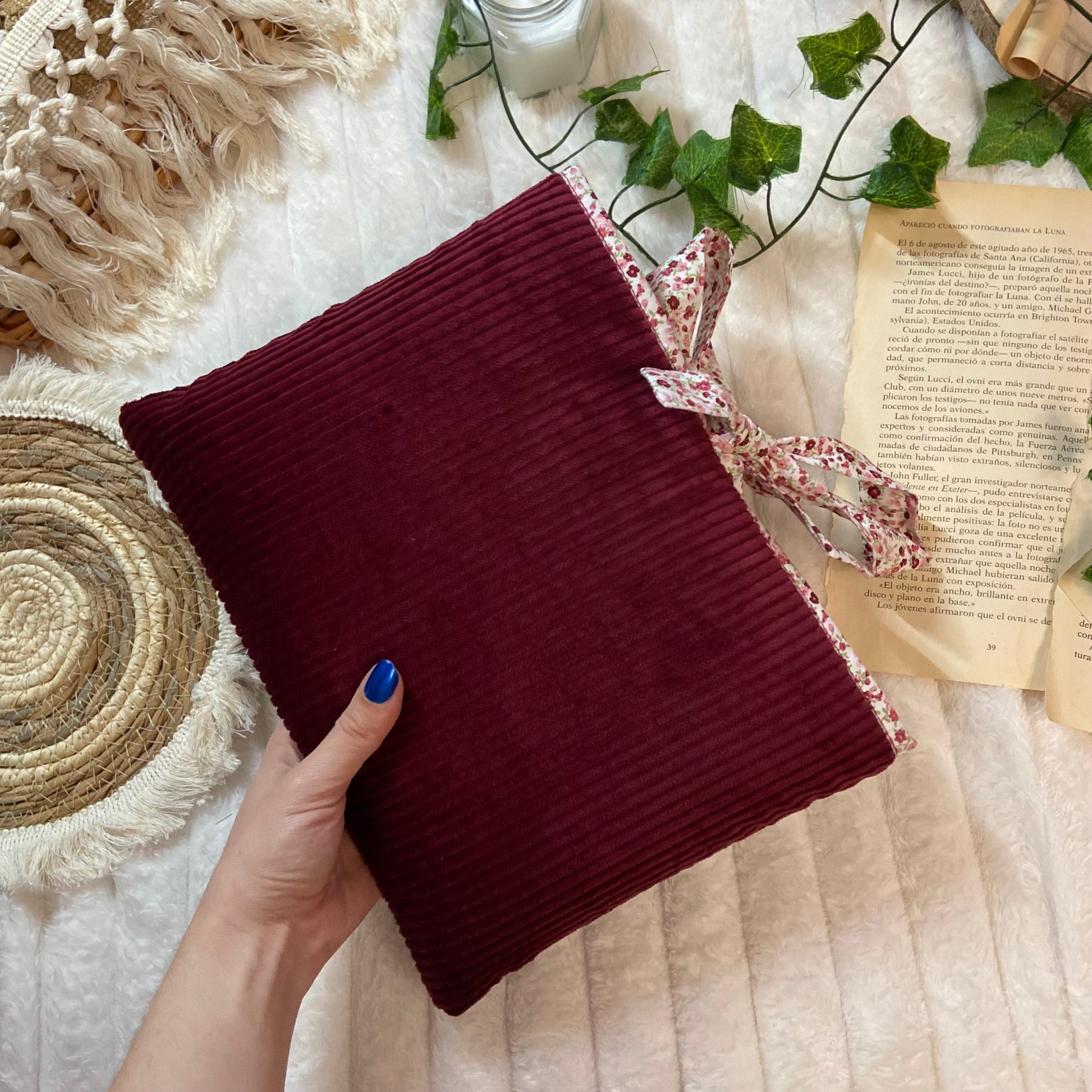 Funda literaria de pana en burdeos con forro y lazo a conjunto. Las medidas son de 21x28cm