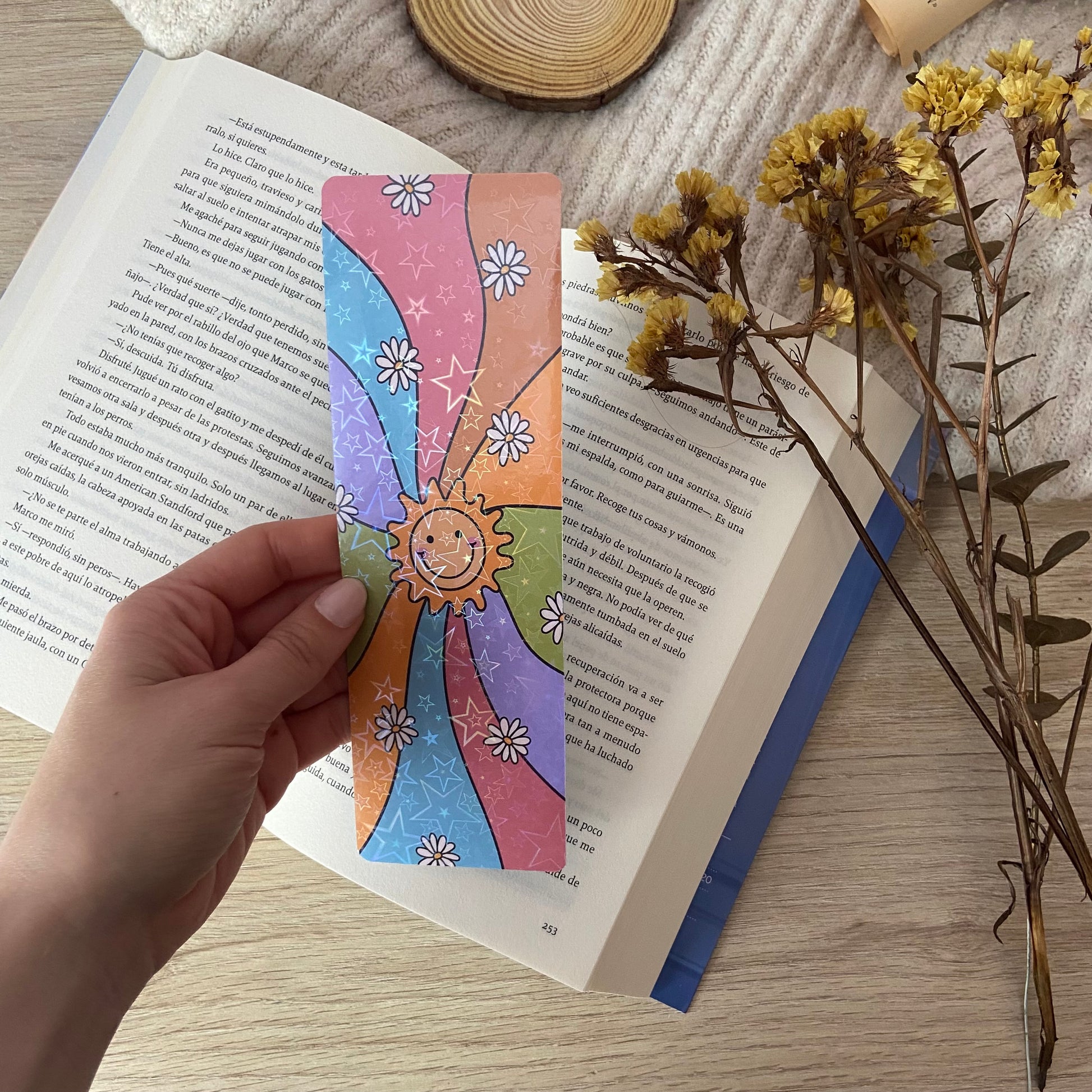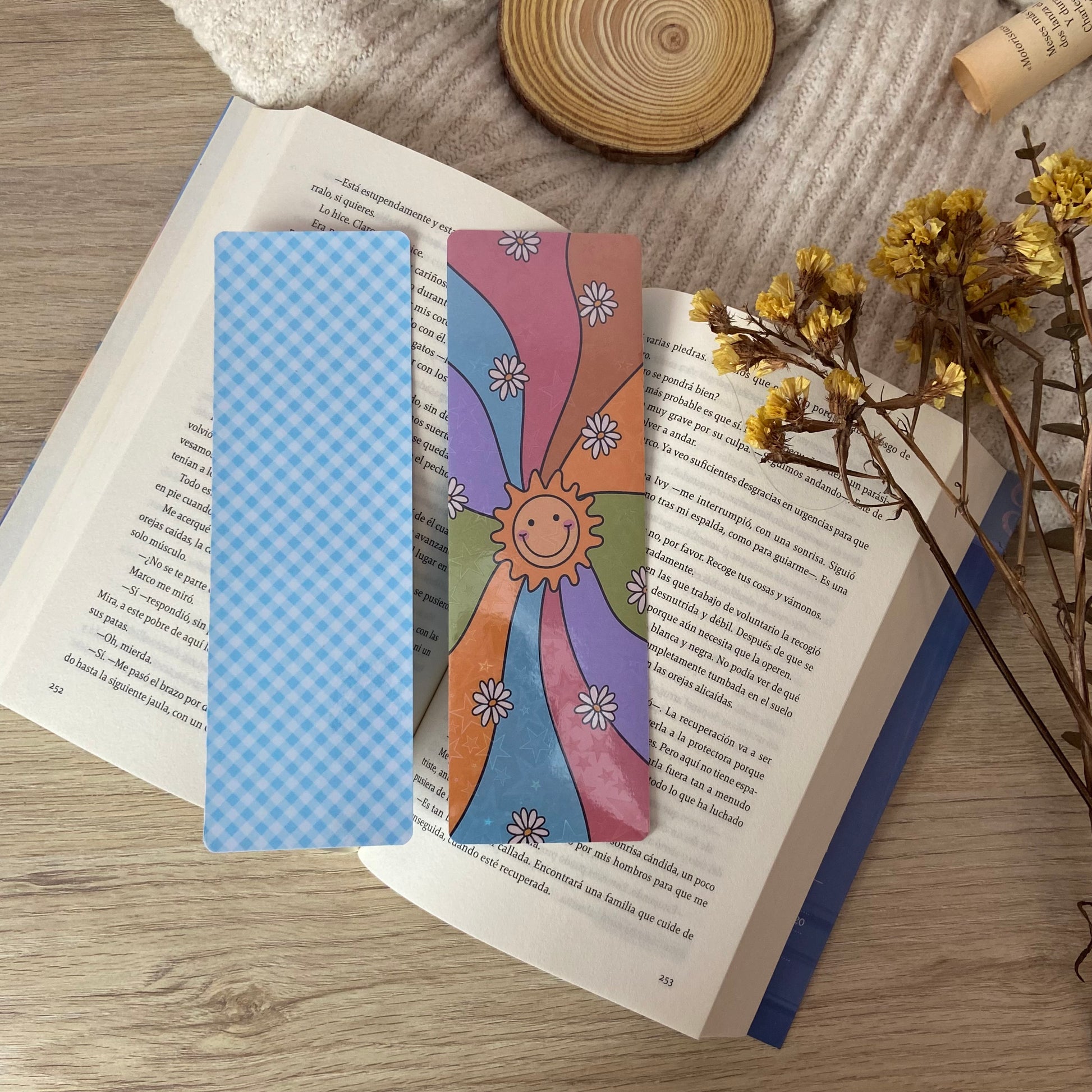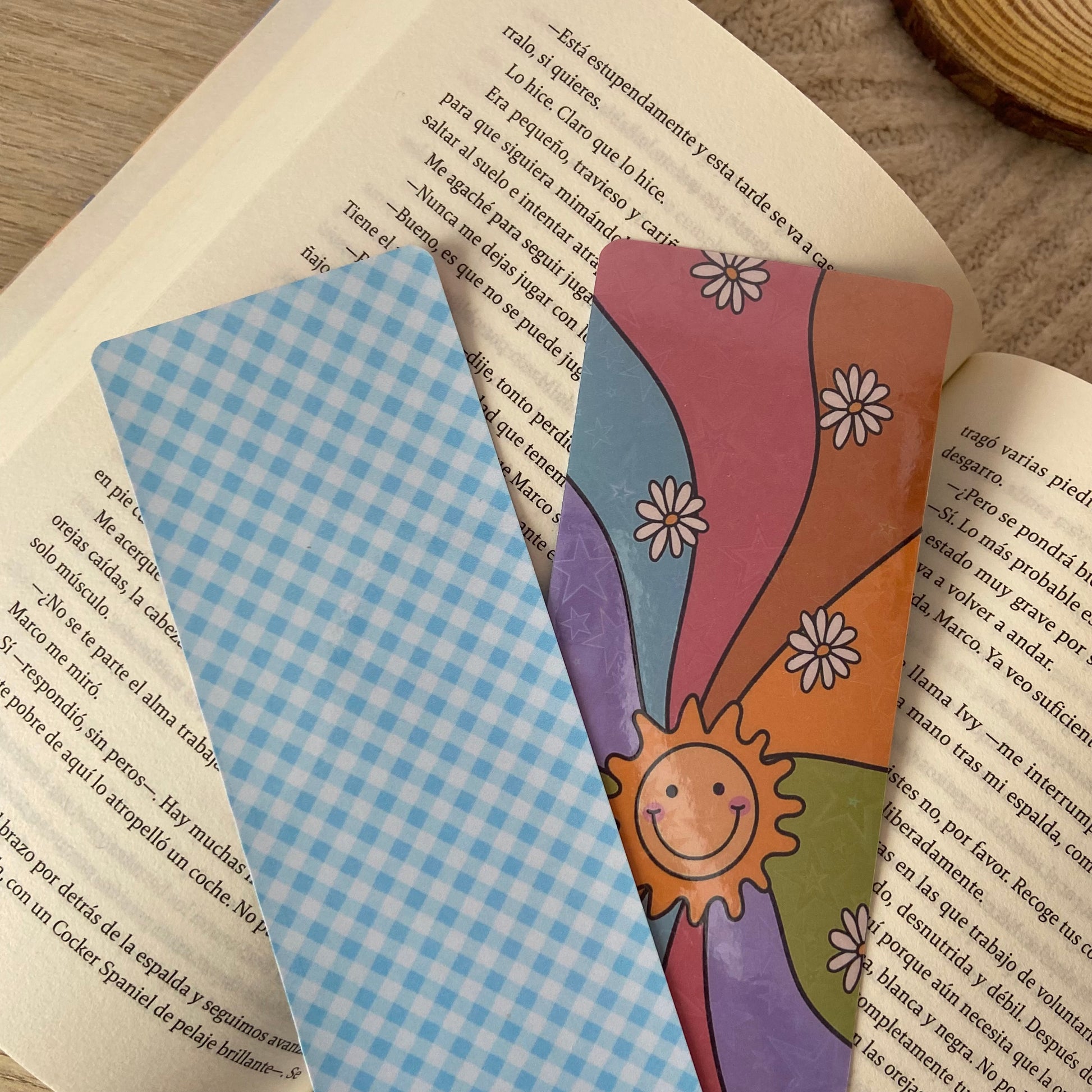 Marcapáginas de papel holográfico plastificado con vichy por la parte de atrás
